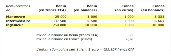 On remarque qu'une fois les revenus convertis en bananes, un manœuvre béninois a moins de trois fois moins qu'un manœuvre français (le pauvre) alors que l'ingénieur béninois, lui, eh oui, égalise le score de son homologue français (l'enfoirééé !).