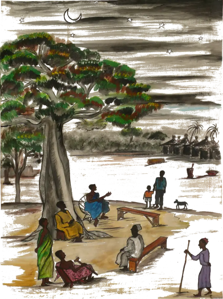 En toile de fond, un environnement communautaire : une morale et des liens moraux. Partout, occupant la totalité de la scène, un marché africain. Devant nous, qui observe le marché, notre héros, un Occidental peut-être un peu perdu devant la profusion des choses et des gens. Le bruit, l'absence d'alignement, de structuration, lui paraissent relever d'une incompréhensible inorganisation. Il est pourtant au-devant d'une société d'une redoutable efficacité, qui permet, avec du temps, de retrouver quiconque et où qu'il soit. Notre Occidental est décontenancé. Un peu craintif, un peu innocent. Sa planète est bien loin, il y a laissé ceux qui l'aiment et qu'il aime, mais en a-t-il déjà conscience ? Cet Occidental est un peu notre Petit Prince. L'Occident forme des gens sérieux. Mais l'Afrique est un continent mystérieux et l'adulte sérieux se retrouve bien démuni devant l'intensité de la vie sociale des êtres humains. Notre voyageur doit maintenant apprendre à se laisser apprivoiser, à s'attacher, à recevoir des cadeaux, à en faire, à se laisser initier. Il lui faut apprendre à vivre en communauté, apprendre à mettre un sens sur des valeurs forgées dans les rites venus du passé… Toutes ces choses prennent du temps.