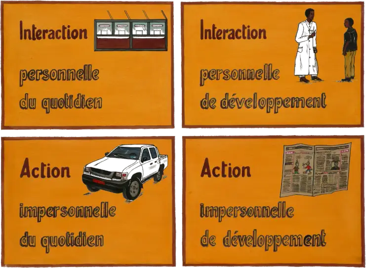 Le tableau de ceux qui agissent avec des guichets de transfert d'argent, la discussion entre un prêtre et un fidèle, une 4x4 de projet humanitaire, un article de journal.