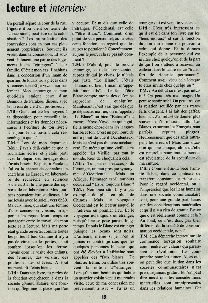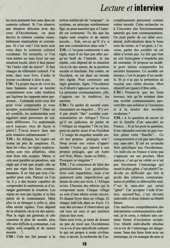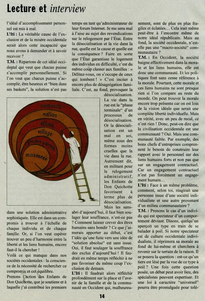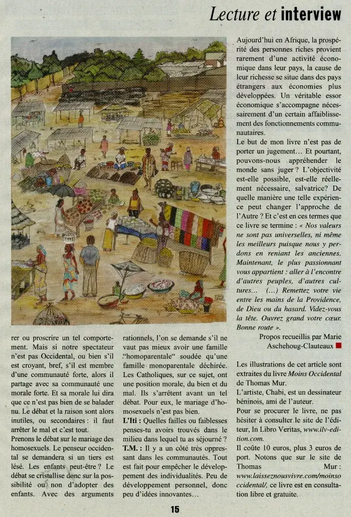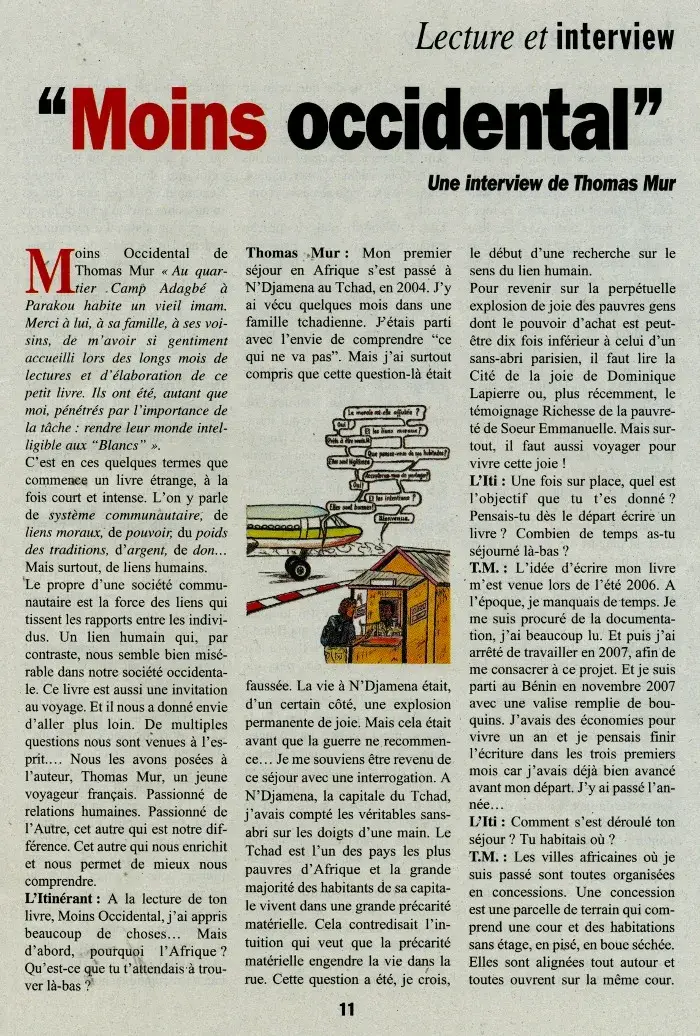 L'Itinérant n° 765 paru le 20 juillet 2009 consacre un dossier de cinq belles pages à une interview de l'auteur du livre Moins occidental.